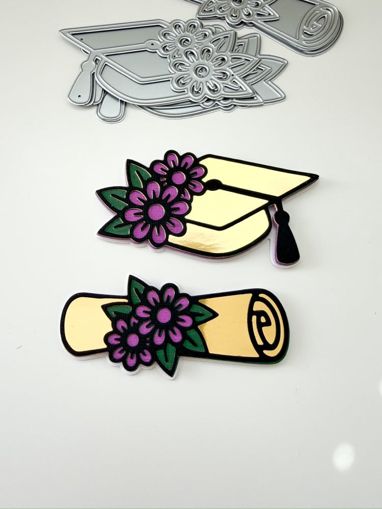 **** Note: this is a metal die cut, a tool to cut 65 lb cardstock ONLY. Will not cut glitter or thicker coated material. This is not a finished product or graduation lei ****